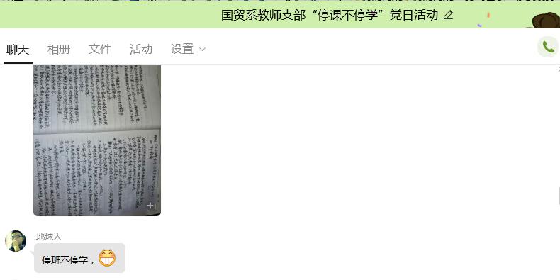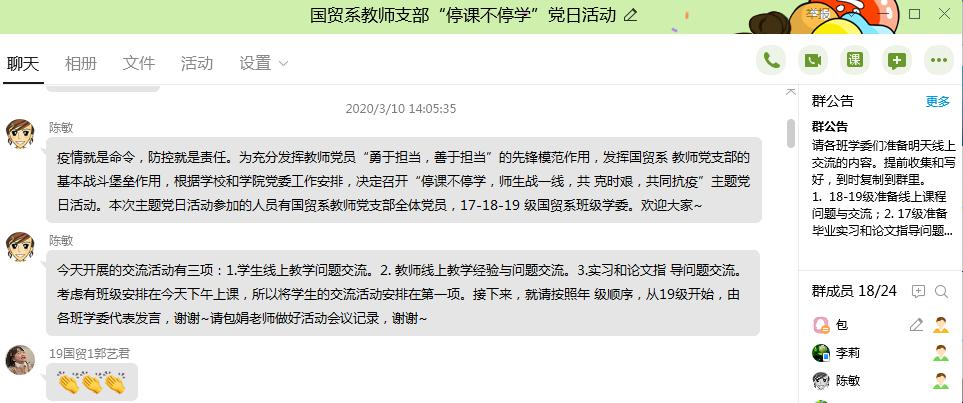 疫情就是命令,防控就是责任。为充分发挥教师党员“勇于担当,善于担当”的先锋模范作用,根据学院党委工作安排,国际经济与贸易系教师党支部于3月10日(星期二)下午2时依托QQ群线上会议的形式开展“停课不停学,师生战一线,共克时艰,共同抗疫”主题党日活动。全系党员老师和17、18、19级学生代表参加了此次活动。