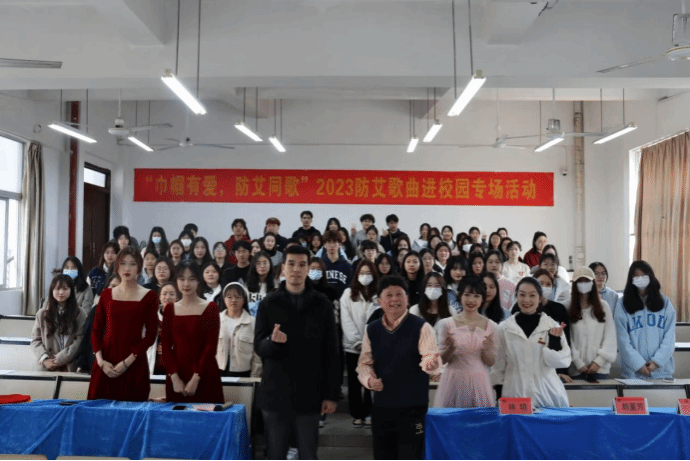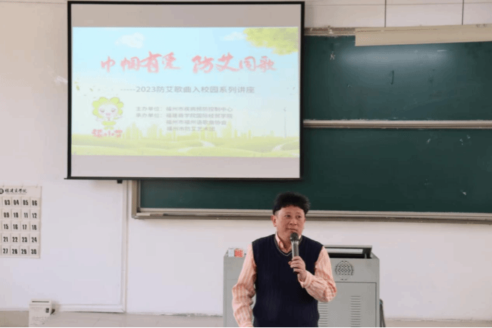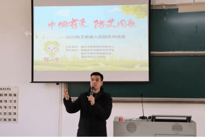 福州市疾病预防控制中心防艾科科长张宏为同学们作防艾知识主题宣讲,详细讲解艾滋病的临床表现、传播途径以及预防措施等基本常识。福州市福州语歌曲协会主席、福州市防艾艺术团执行团长赖董芳向同学们介绍推广了五首防艾歌曲,将防艾知识融入艺术创作,让同学们接受了一场别开生面的艾滋病预防教育。现场还开展了防艾知识问答和互动表演,世界杯歌手队的6名同学演绎了赖董芳老师创作的防艾歌曲《我不艾》,声情并茂的表演,将现场气氛推向高潮。
