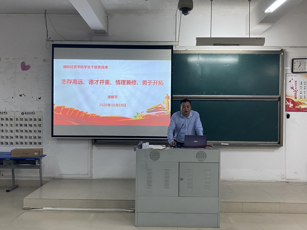 为加强学生干部队伍建设,提高学生干部的综合素质,2020年10月19日,学院党委副书记(主持党委工作)廖新平在诚信楼T2给学生干部上了一堂以“志存高远、德才并重、情理兼修、勇于开拓”为题的思政课。许模春副书记、辅导员、团委学生干部和20级新生助导等70余人参加本次活动。