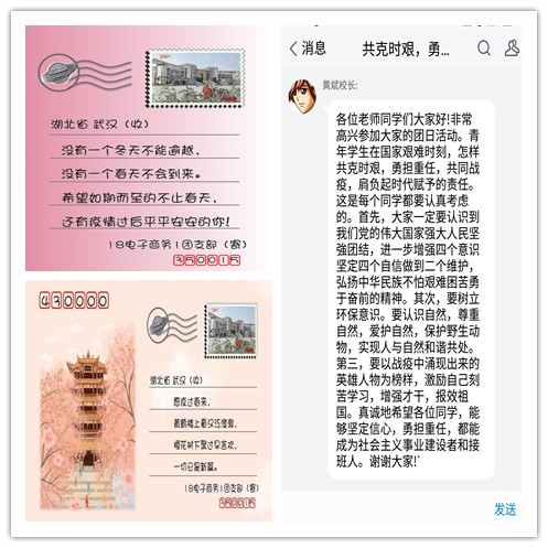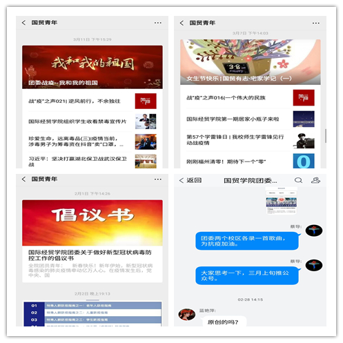 党旗所指,就是团旗所向。疫情期间,世界杯体育官方网站团委始终坚持服从党委号召,切实做好党的助手和后备军,充分发挥团组织是党联系学生青年的桥梁和纽带作用,以团支部为主要抓手,以团日活动和主题班会为载体,加强30个团支部的联系交流,动员全体约50名共青团干部全程参与协助,充分发挥广大团员的“主力军”作用,筑牢防疫防控的青春战线。第一时间下发《世界杯体育官方网站团委关于做好新型冠状病毒防控工作的倡议书》,倡议全院青年团员积极响应组织的号召,积极行动,充分发挥作用,科学对待疫情,做好自我防护工作,积极配合排查,合理安排假期,努力提升自身综合素质;认真组织各团支部有序开展“共克时艰·勇担使命”线上主题团日活动,为进一步推进学校疫情防控工作,增强团组织的战斗力,校黄斌校长深入班级,“走进”所联系的18级电子商务1班,与学院党委领导班子共同参加线上主题团日活动,黄斌校长对团日活动给予充分肯定,并希望同学们认识到我们党的伟大国家强大和人民坚强,树立环保意识,尊重和保护自然,实现人与自然和谐共处,以及要以战疫中涌现出来的英雄人物为榜样,激励自己刻苦学习,增强才干,努力成为社会主义事业建设者和接班人。