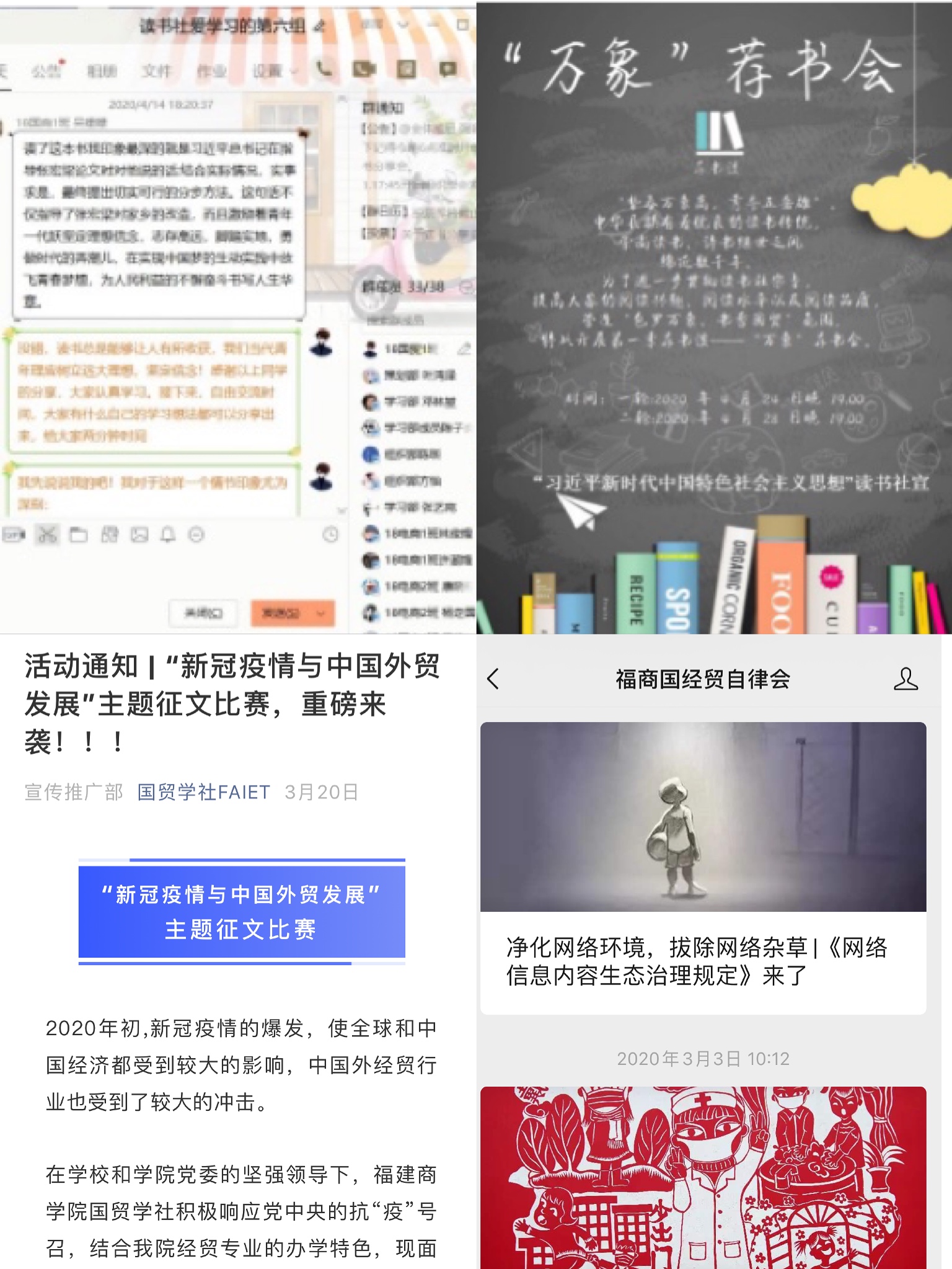 世界杯学生会、习近平新时代中国特色社会主义思想读书社、国贸学社、自律会等纷纷发挥组织力量,通过线上形式开展了主题丰富、形式多样的活动,不仅丰富了同学们的居家生活,同时增强了防控意识和能力,为学院疫情防控注入活力和动力。学生会通过征文、征画和征视频等形式开展线上第二课堂活动15场次,广大青年团员踊跃参与,衍生出一批优秀的网络作品;习近平新时代中国特色社会主义思想读书社认真制定每月读书活动计划表,计划完成6本书目的分享会,目前为止,已顺利开展《习近平在厦门》、《习近平在福州》2场读书分享会,并组织了第一季“荐书谈”万象荐书会、主题为“同心战‘疫’,同‘屏’共振”疫情网络知识竞赛以及主题为“最美逆行人,灯火守护者”的给逆行者的一封信的征文活动3场线上活动,300余名读书社社员精心准备,踊跃参与,认真总结,积极分享读书心得,遴选出30余篇优秀的读书笔记;国贸学社结合世界杯经贸专业的办学特色,开展以“新冠疫情与中国外贸发展”为主题的专业学术论文活动,在院长庄惠明、学社指导老师林航博士和多名专业教师的大力指导下,评选出9篇优秀论文,为后疫情时代我国和我省外贸行业的平稳发展贡献了专业智慧;自律会切实做好疫情实时动态、科学防护知识、最新防控要求等线上科普和宣传工作,通过微信公众号共推送30余篇文章,努力营造“科学防疫,勇担使命”的良好舆论氛围。