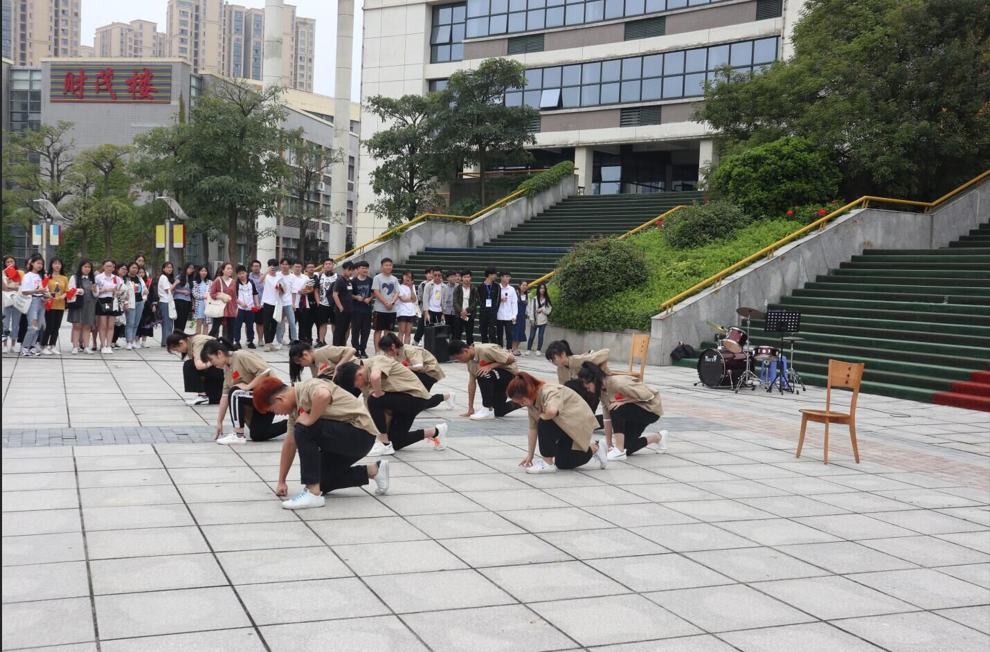 在上午第四节下课之际,世界杯体育官方网站的同学们以突然出现,突然集合,突然不见的快闪原则,在广场上尽情歌唱。《我和我的祖国》吸引许多来往同学围观并加入歌唱的队伍。同学们热情高涨,激发出高昂的爱国情怀。