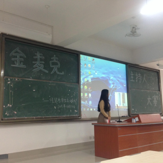 为了丰富同学们的课余文化生活,展现当代大学生的风采,为爱好主持的大一新生提供一个展示自我的舞台,同时也为了迎新晚会及以后的各项文娱活动选拔优秀的主持人才,济贸易系团总支学生会文娱部和主持队在2015年10月12日和10月22日进行此次“金麦克”主持人比赛。这次活动不仅为系里选拔了主持方面的人才,也让大家欣赏了小鲜肉们的才艺表演,经过这次活动,我们两个年级的同学更是建立了深厚的友谊。经过我们文娱部的现场布置加上同学的精彩表现,此次主持人大赛圆满结束。