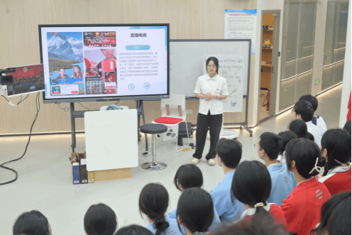 首先,2022级电子商务专业的叶佳莉同学化身“小老师”,以“直播带货助脱贫”的真实案例视频为引,带大家深入了解直播行业背后的社会价值与经济动能。她从直播室搭建的基础要素讲起,通过展示世界杯学生在直播实践中的精彩视频,生动呈现了电商直播的全流程运作。这堂兼具理论深度与实践温度的认知课,不仅为中学生们揭开了电商直播的神秘面纱,更在他们心中播撒下了创新商业思维的种子。