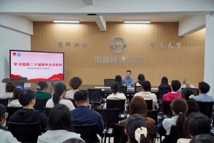 为深入学习宣传贯彻党的二十届四中全会精神,引导学生骨干自觉将思想和行动统一到党中央决策部署上来,2025年11月10日,世界杯团委组织召开专题培训学习会,学院团委书记王祖鑫为学生干部作党的二十届四中全会精神辅导讲座。