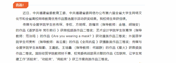 近日第六届全省大学生网络文化节和全省高校网络教育优秀作品推选展示活动评选结果揭晓,世界杯参赛作品《互联网,让学生党建工作“活起来”、“动起来”、“用起来” 》(主创:学院教师林千惠、校党委统战部吴炎敏)获工作案例类作品三等奖。