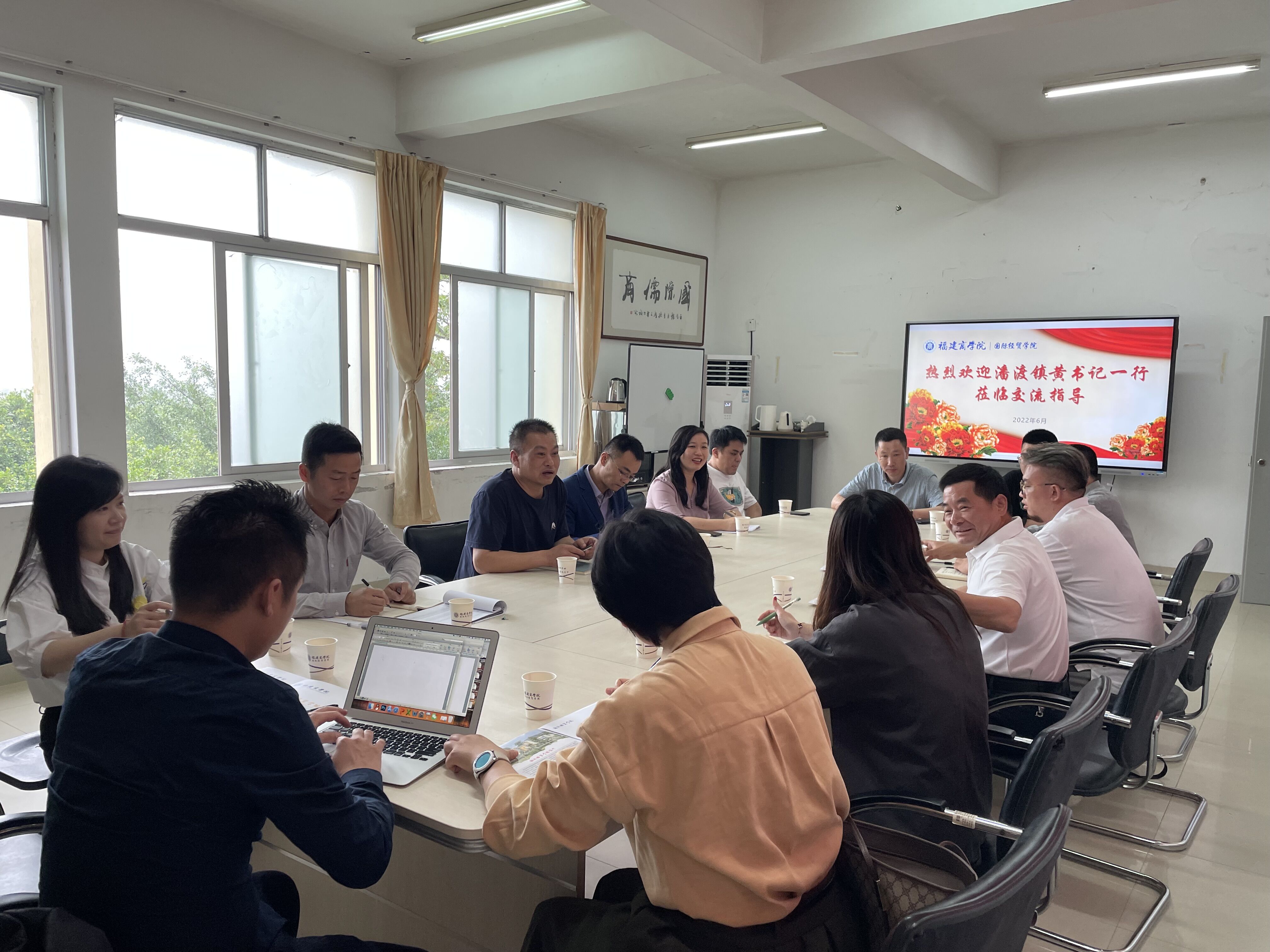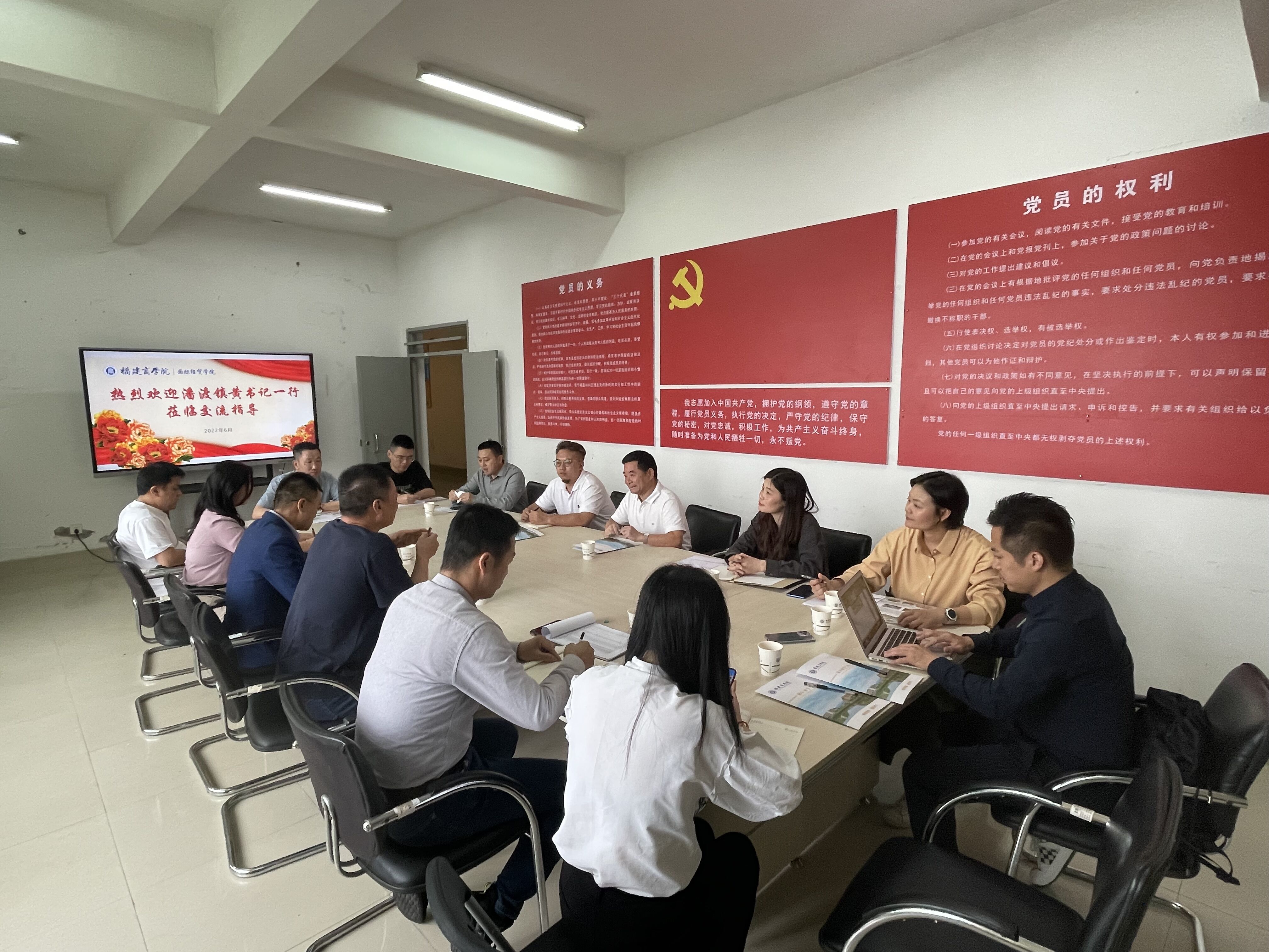 6月10日下午,潘渡镇党委书记黄端明率福州源丰海洋科技有限公司董事长肖良栋、连江臻鲜网络直播有限公司总经理刘登峰一行9人赴世界杯开展校企合作洽谈。党委书记廖新平、党委副书记许模春、办公室主任王艳、电子商务系主任李民、电子商务专业辅导员林千惠、黄儒鸿参加会议。