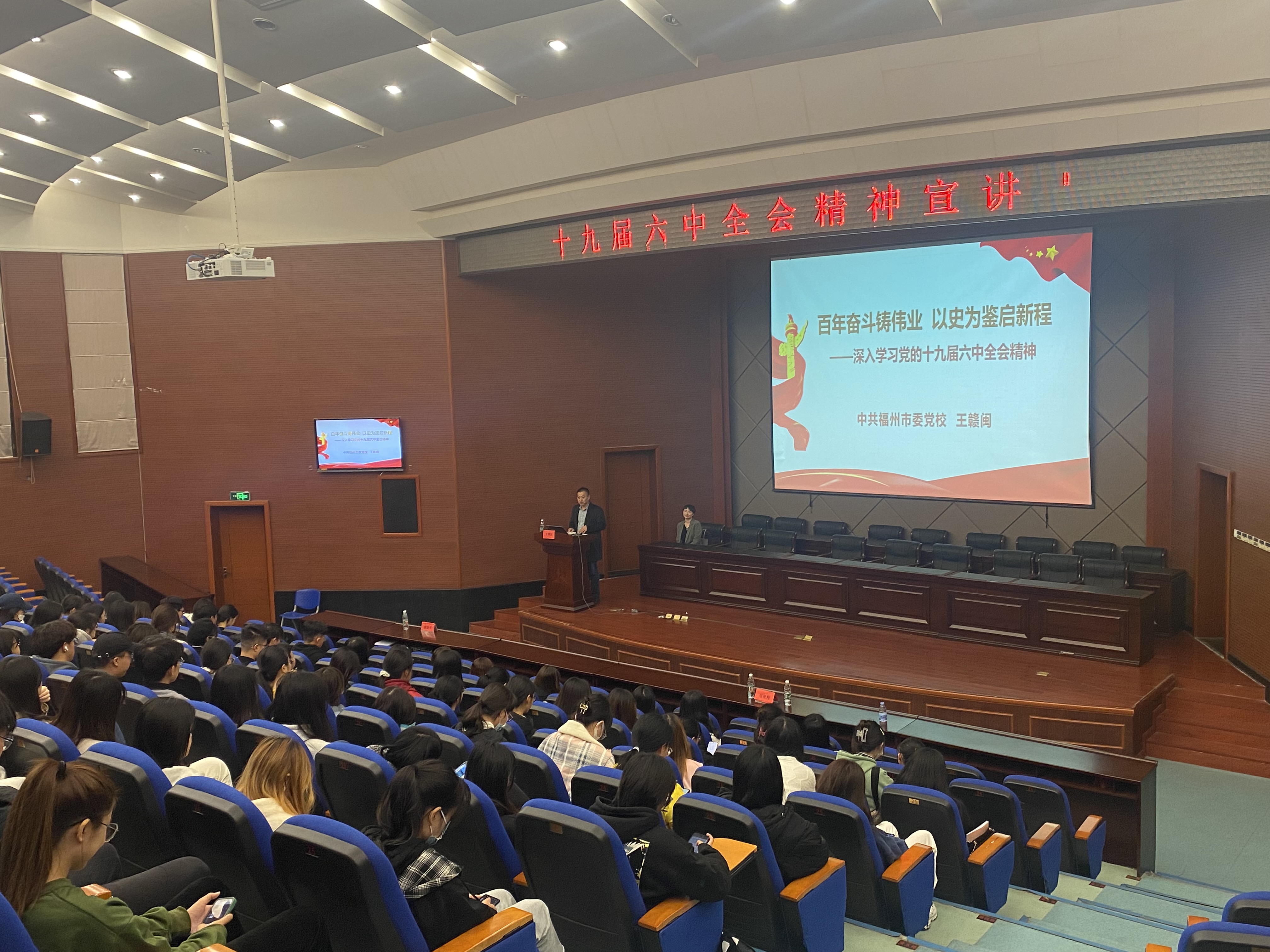 12月9日,世界杯体育官方网站习近平新时代中国特色社会主义思想读书社在学术报告厅举办党的十九届六中全会精神宣讲会,福州市委党校副教授王赣闽应邀作专题辅导讲座。学院党组织负责人、读书社指导老师、读书社全体成员参加宣讲会。