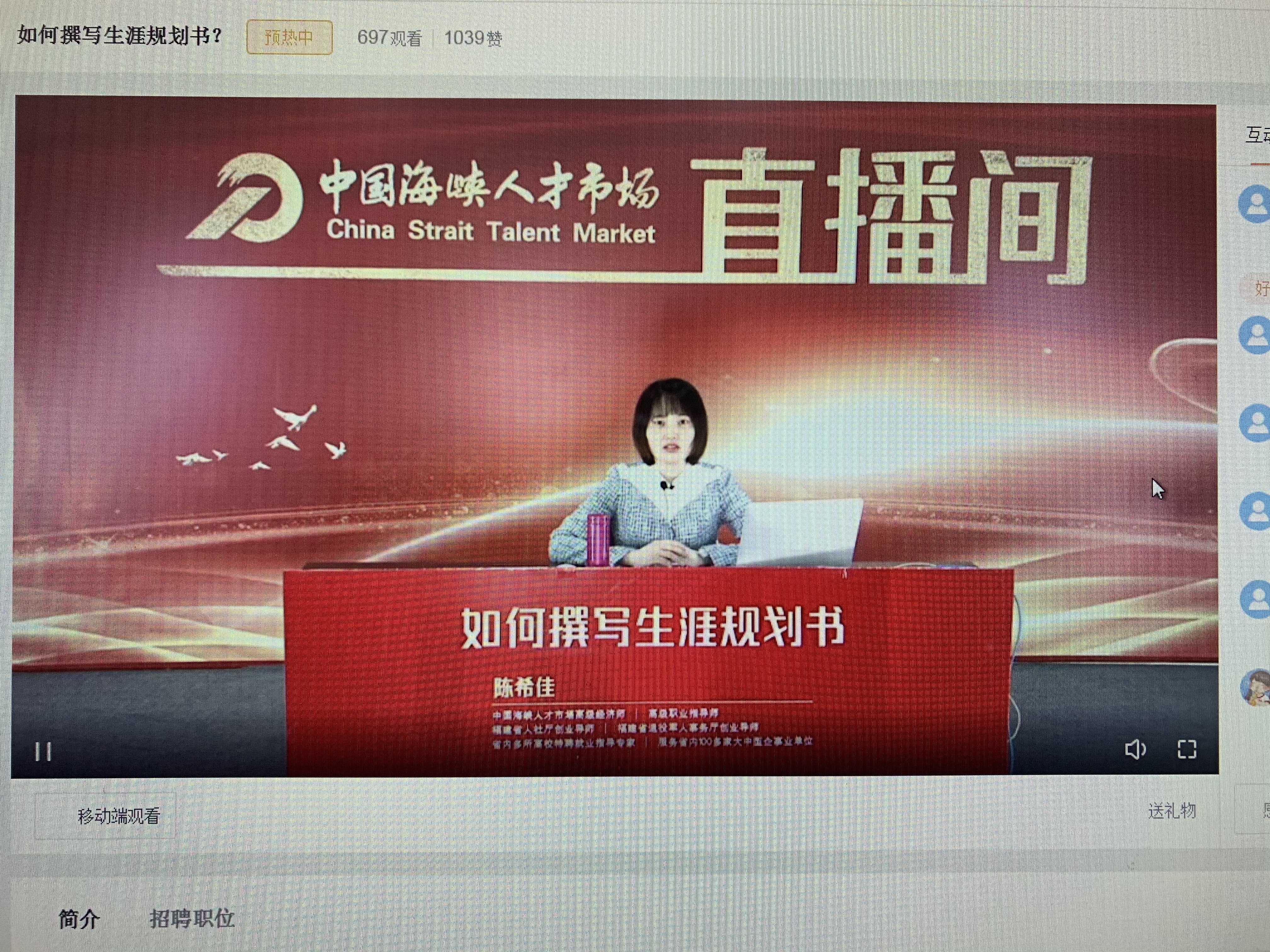 2022年4月2日,世界杯体育官方网站邀请中国海峡人才市场高级经济师陈希佳为世界杯学生开展“如何撰写职业生涯规划书”主题线上直播讲座,学院共有1500余名师生参与了此次讲座。