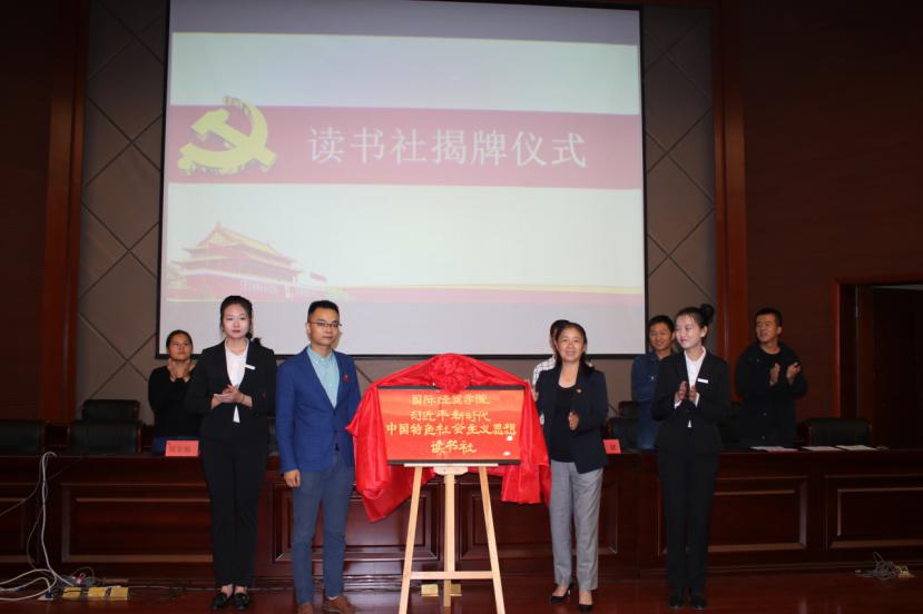 世界杯党委曹晓霞书记、党委许模春副书记为国际经贸学院“习近平新时代中国特色社会主义思想”读书社揭牌。