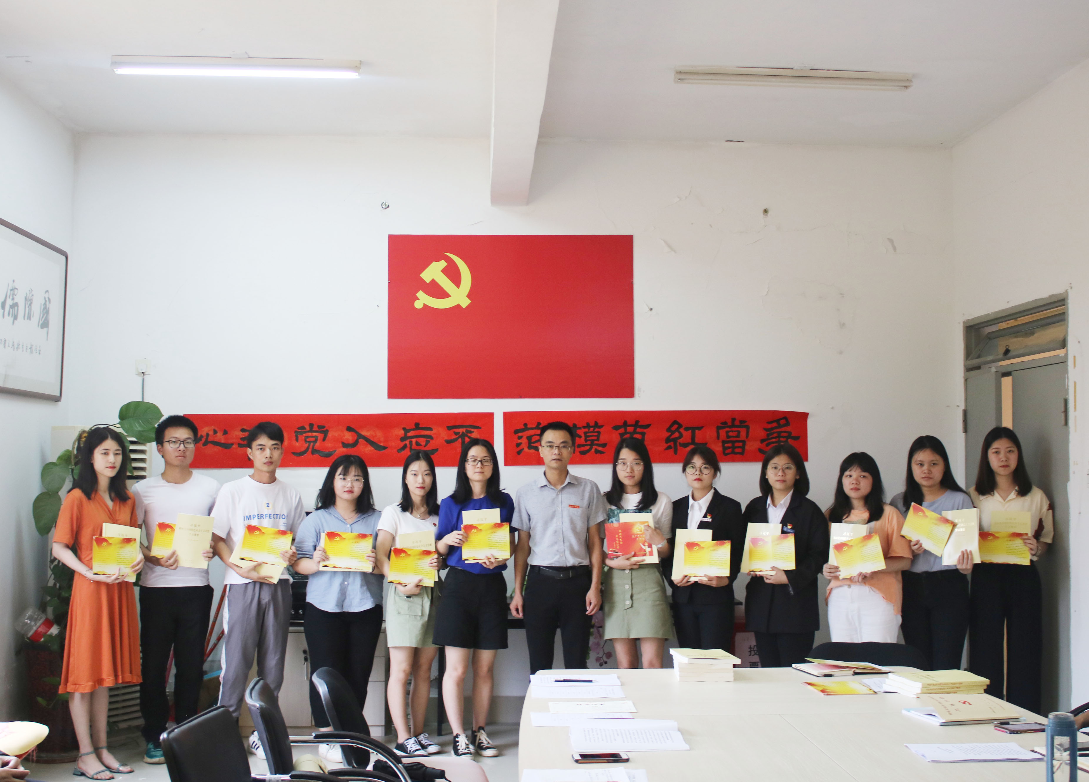 发言过后,国经贸学院许模春副书记为全体毕业生党员赠送《习近平新时代中国特色社会主义思想学习纲要》,提醒毕业生党员坚持理论学习;为部分近期过政治生日的毕业生党员发政治生日贺卡,叮嘱牢记党员身份。之后,党员们一起重温入党誓词,铭记“不忘初心、牢记使命”。