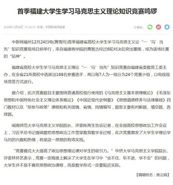 日前,由福建省委教育工委主办的福建省高校大学生学习马克思主义论“一‘马’当先”知识竞赛首季比赛在福建教育电视台成功举办。经贸系学生黄智杰经过6轮对决后突出重围,成为该场比赛的“站神”,直接进入到半决赛。中国新闻网以《首季福建大学生学习马克思主义理论知识竞赛鸣锣》为题报道了该场比赛。新闻链接:http://www.fj.chinanews.com/news/2016/2016-12-24/370026.shtml?open_source=weibo_searc