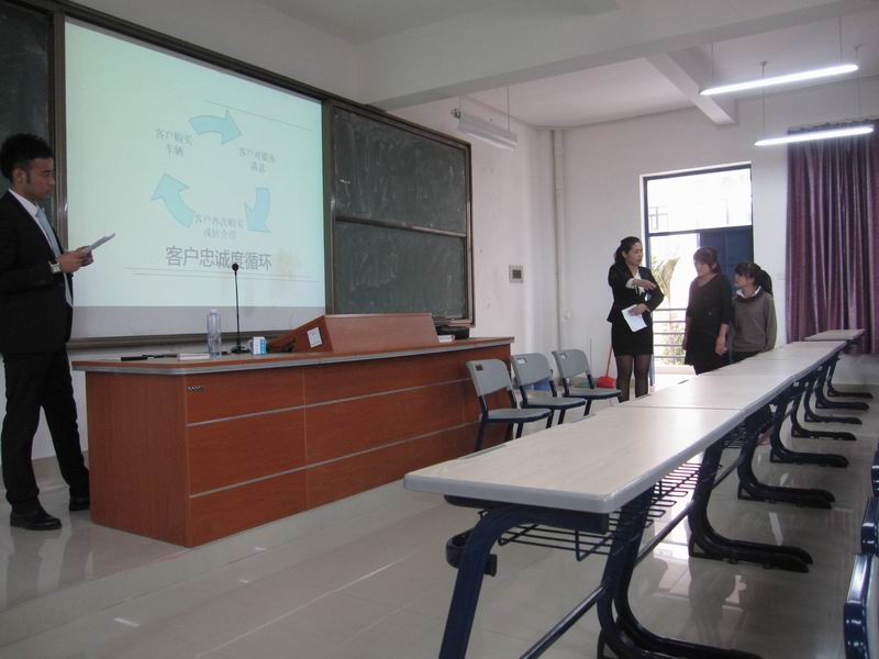 程轩老师是宝马汽车的专职销售内训师,负责公司销售部销售顾问的内训工作,包括新进员工培训、汽车产品知识、销售流程、销售技巧等培训,具有丰富的销售培训经验。讲座中程轩老师就汽车销售的流程和相关销售技巧进行了详细解说,市场营销专业学生互动热烈。其中有三名学生进行现场汽车模拟销售,程轩老师进行亲切点评和指导。