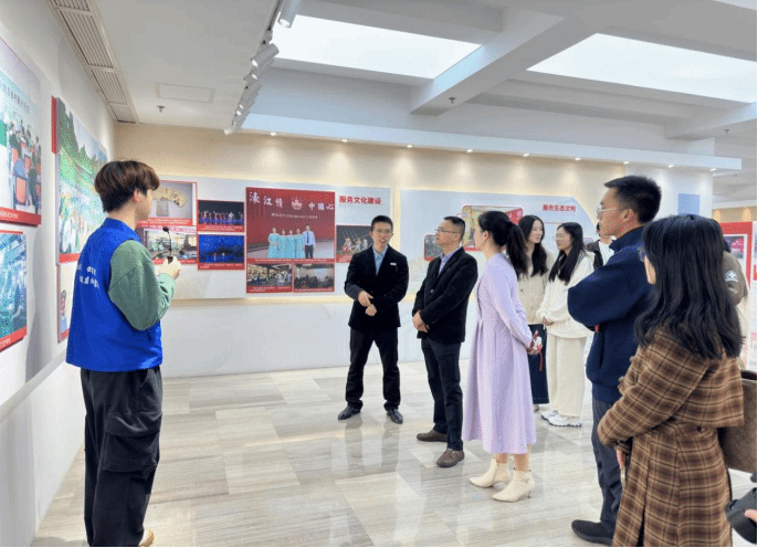 讲解员为学院老师们与学生代表介绍闽江学院发展历程
