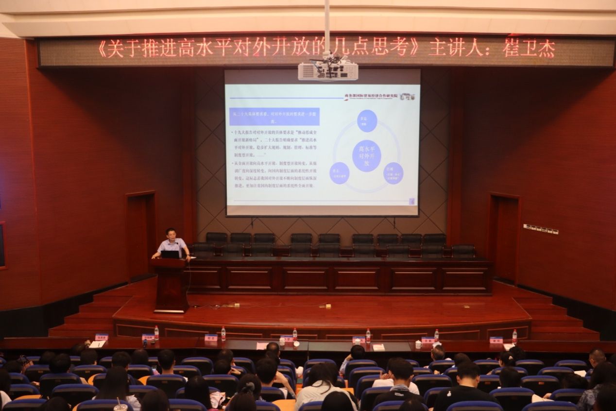 崔卫杰研究员作题为《关于推进高水平对外开放的几点思考》的专题讲座。他聚焦高水平对外开放,总结并阐释了其时代特征、核心问题、总体思路以及中国自由贸易区的阶段性特征。他指出,应从提升制度创新能级、产业集聚能级、要素配置能级、区域协调能级、数字贸易能级与安全发展能级等6个方面,进一步推进高水平开放。