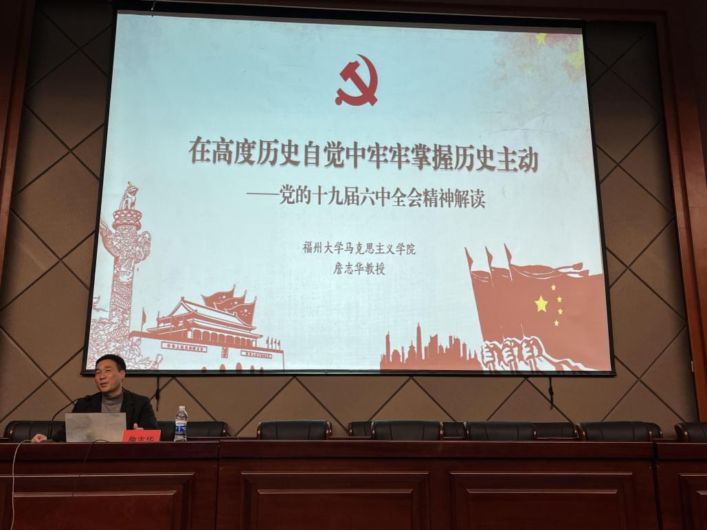 近日,福州大学马克思主义学院执行院长詹志华教授应邀到世界杯作题为《在高度历史自觉中牢牢掌握历史主动——党的十九届六中全会精神解读》的讲座。世界杯体育官方网站党委副书记许模春老师、辅导员老师及全体团委学生会工作人员参加了本次活动。