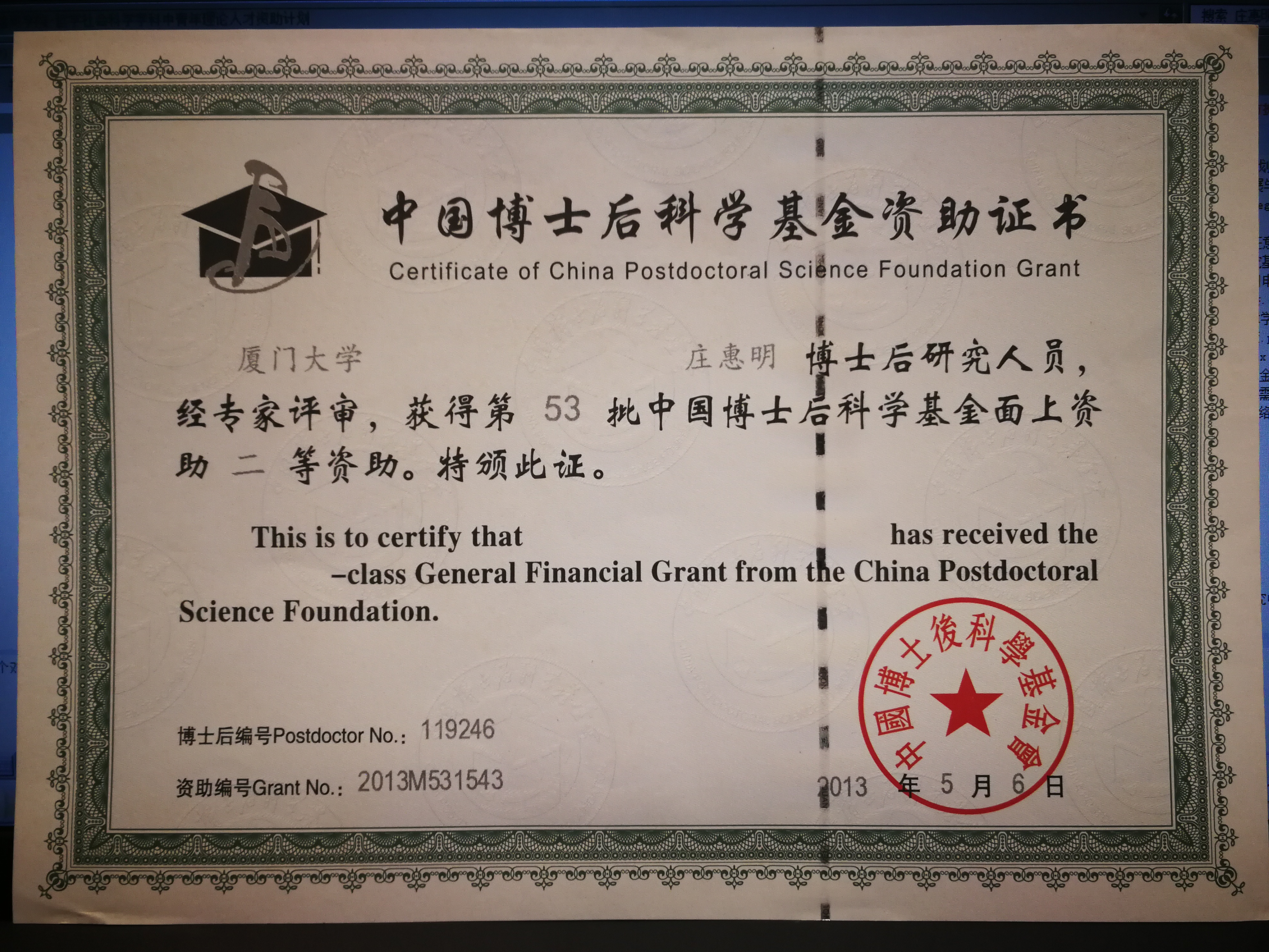 庄惠明-中国博士后科学基金资助证书
